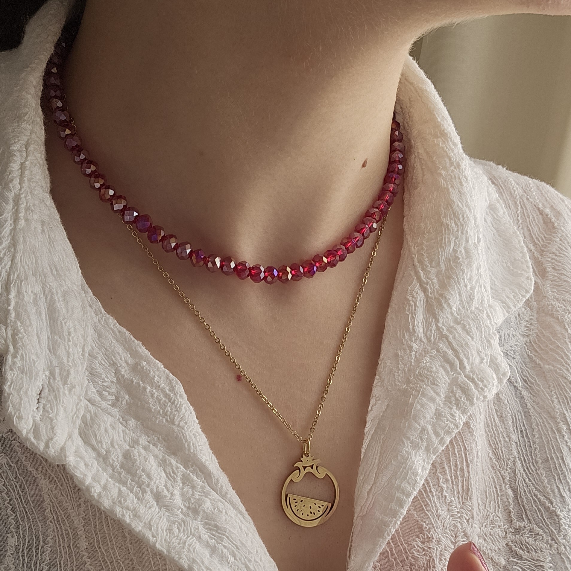 گردنبند دو لاین هست ترکیب گردنبند طلایی با پلاک انار و سنگ کریستالی سرخ رنگ ثابت زنجیر بلند ۶۰ سانت زنجیر کوتاه ۴۵ سانت