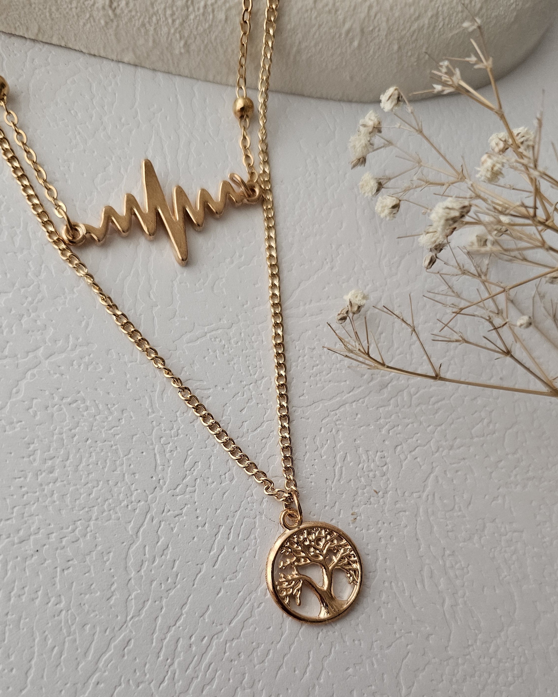 گردنبند دو لاین متصل هست یکی طرح درخت ثروت و دیگری طرح ضربان قلب برای حفظ نگهداری کیفیت اولیه دور از شوینده و الکل بماند.